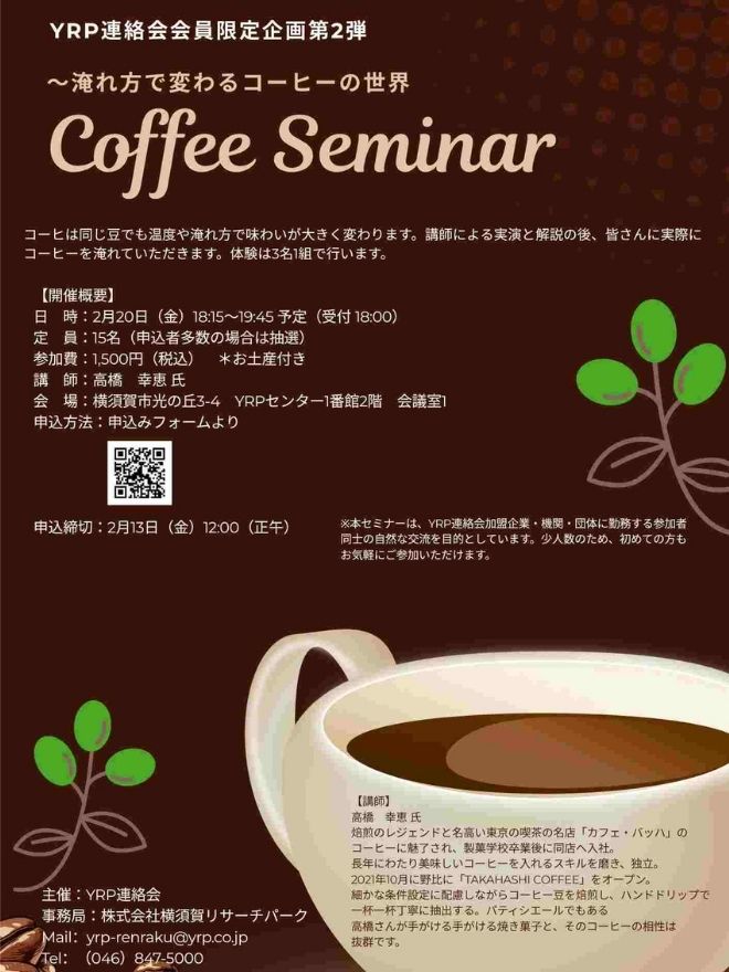 YRP連絡会主催の企画第2弾としてコーヒーをテーマにした少人数制のセミナーを開催します。