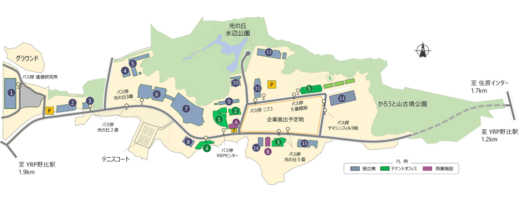 YRPは、東西約1.7キロ、南北約700メートルの丘陵地に展開しています。地形を生かした基盤整備を行い、水と緑に触れ合える自然を残すなど、研究開発活動に適した落ち着いた環境が整えられています。